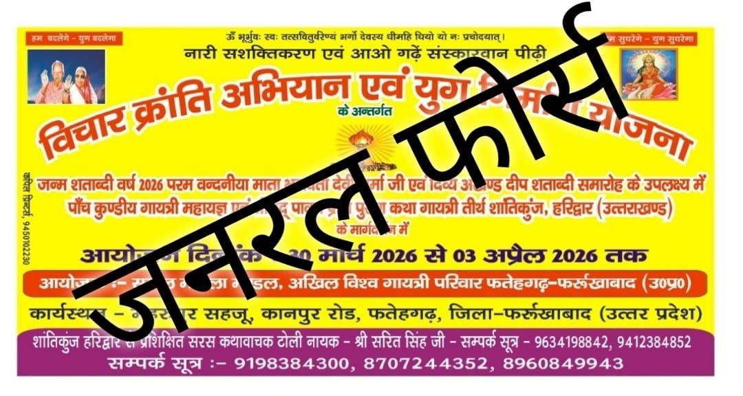 पांच कुण्डीय गायत्री महायज्ञ एवं श्रीमद् पावन प्रज्ञा पुराण कथा का आयोजन 30 मार्च से 03 अप्रेल तक।