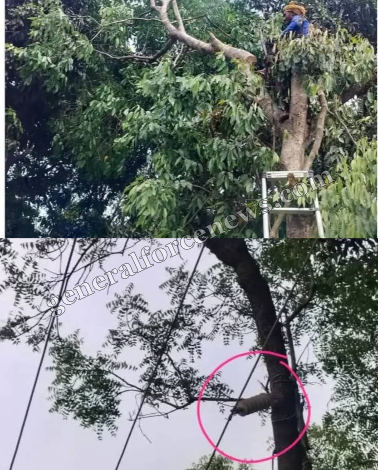 33 KV लाइन बिछाने में ठेकेदार ने नियमों की उड़ाईं धज्जियां , पोल की जगह पेड़ में फंसाया हाई-वोल्टेज इंसुलेटर।